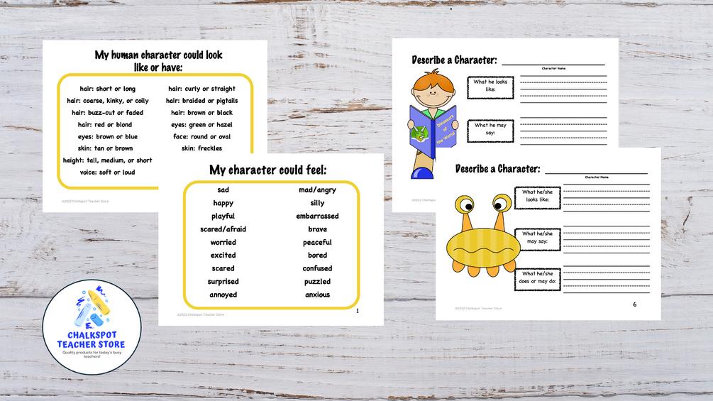 - Seven character description guided practice sheets, including a sheet for your student to describe themselves as a character;
