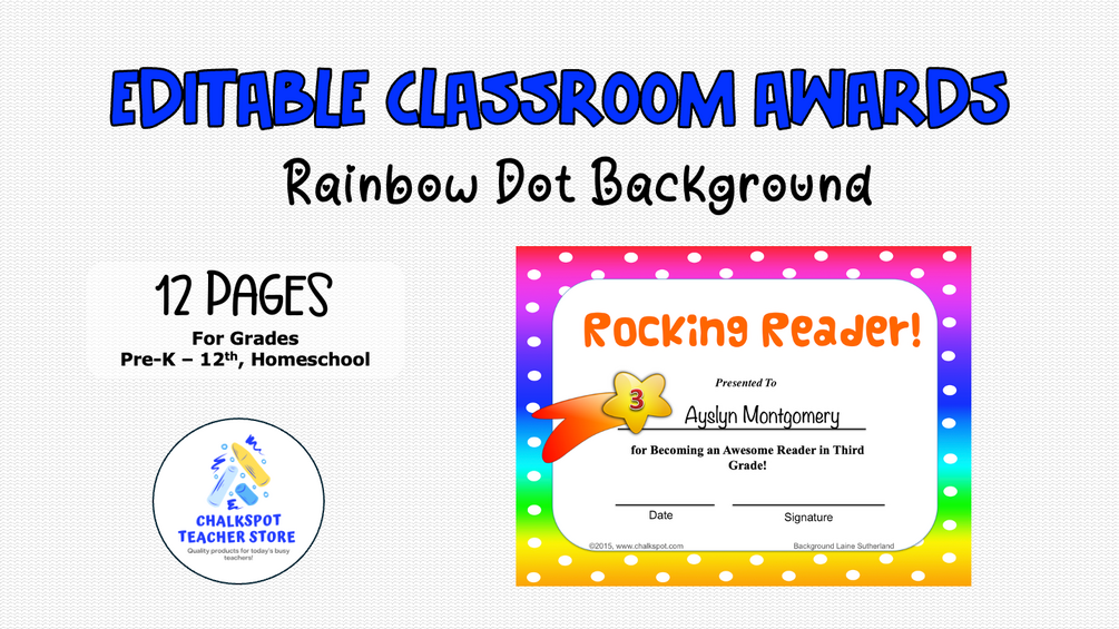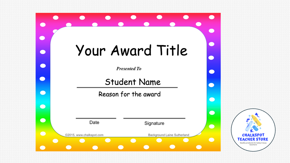 - 12 slides each with rainbow yellow polka-dot background award template;