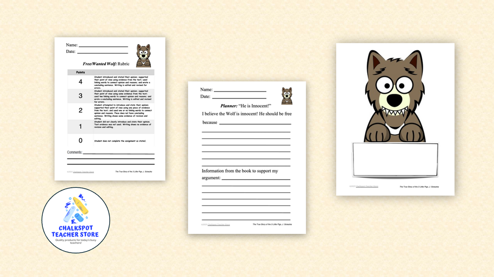 What if A. Wolf is innocent and only wanted a "...cup of sugar for his Granny's birthday cake?" Now your students can decide based on the text evidence if they believe the wolf is innocent or guilty of hurting the 3 little pigs. This is a fun activity to use after reading The True Story of the 3 Little Pigs, by Jon Scieszka. They will design a Wanted or Free Wolf poster using text evidence to support their argument.